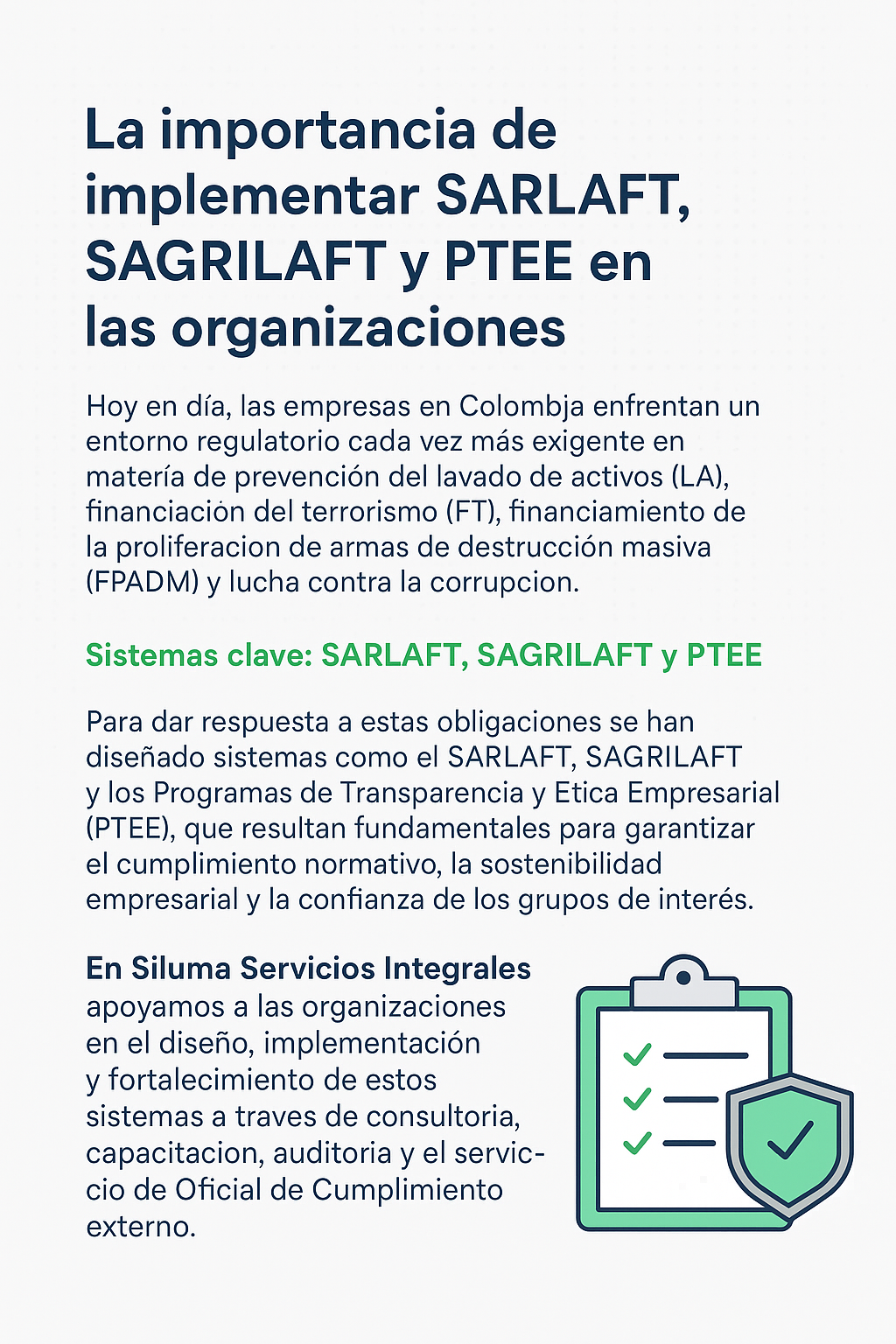 La implementación de SARLAFT, SAGRILAFT y PTEE no debe verse solo como una obligación legal, sino como una herramienta estratégica para fortalecer la gestión empresarial, proteger a la organización frente a riesgos y proyectar una imagen de transparencia y confianza.